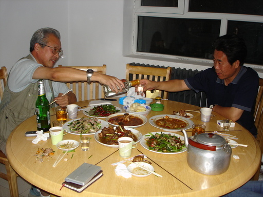 先ずは最初に自己紹介をしあった。自分は名刺を渡し、二人にはメモ用紙に氏名を書いてもらった。ビールで乾杯した後、料理が運ばれてきた。鯉料理や野菜(大根、セロリ)炒めなどが出てきた。飲み物はビールの後は「古城」というアルコール度50%の高級酒で、小さなウィスキーグラスに容れてストレートで飲む。自分も最初の一杯をゆっくり飲んだが本高級酒なのだろう、アルコール度を知らなければきっとぐいぐい行ってしまうだろうと思うほど舌触りが良く、またぴりぴりと喉を焼く様な喉越し感もない。昏倒してしまうとまずいので、最初の一杯を最後の一杯としたが、張さんと胡さんはどんどん進む。