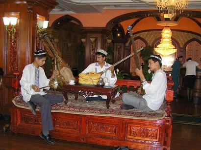 料理が運ばれてくる間の時間、店内で演奏さそれているウィグル音楽の演奏に暫し耳を傾けた。演奏はリズムが軽快であるが、じっくり音色を楽しむという趣ではない。花の歌で、1000年も前から伝えられている「オンシケ・モカム」という歌とのこと。昔は女性が歌う歌で、タンボアール、ドタールという弦楽器とラブという太鼓による演奏をバックに、1〜10の数にちなんだ数え歌(シイーム・マカム、マカム=歌)とのことであったが、個人的な印象だが、ウィグル音楽は、歌舞ワンセットで、舞踏を盛り立てる小道具という感が強い。(写真上2)。