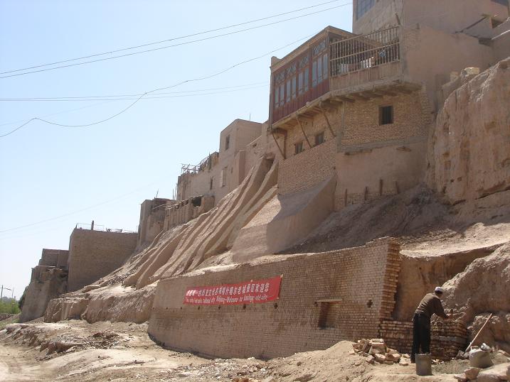 30元の入場料を払い、入口に「カシュガル老城」と書かれている看板の下をくぐり、中に入る(写真上1)。その外観は土とレンガからなり、「城」という漢字が、土から成る、という書く理由が頷ける。トルファンの交河故城、高昌古城の様な遺跡と同じ運命に陥る前駆状態に今あり、土から成る建物で囲まれた観光用地区という感じがしないでもない。