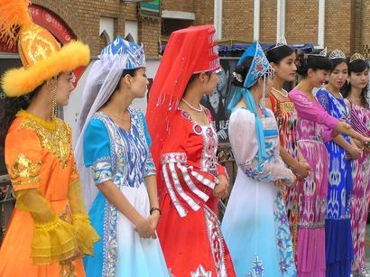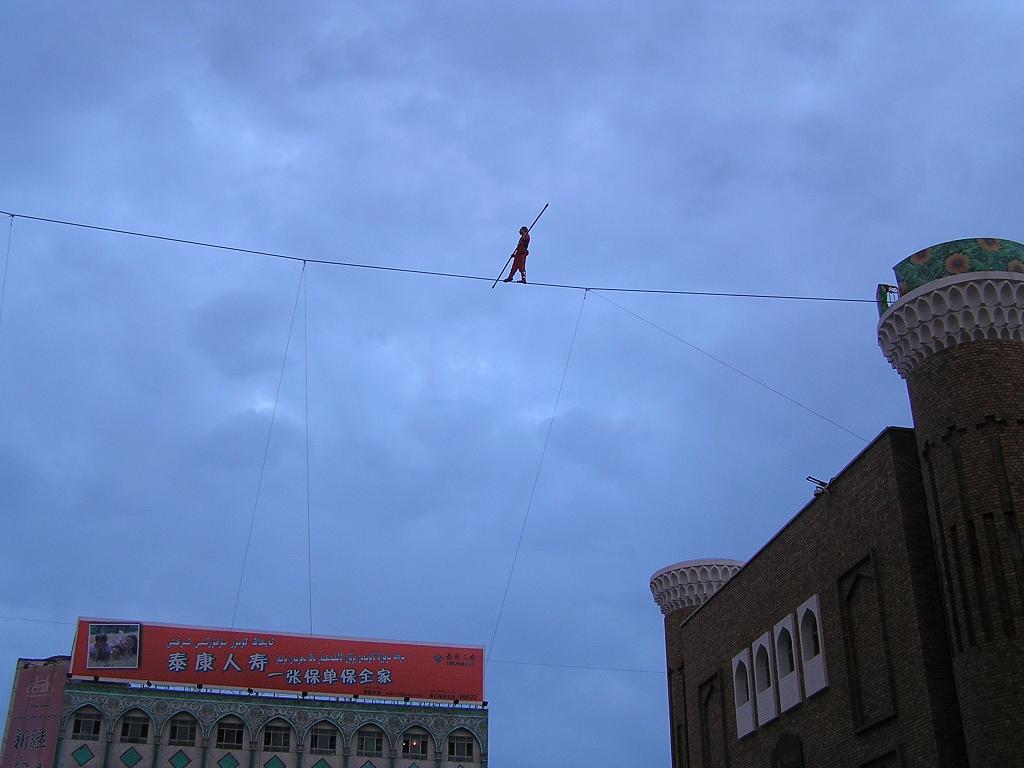 最初の出し物は歌舞というより曲芸、空中綱渡り”達瓦孜”である(写真上3)。そして、カラフルな民族衣装を着飾った踊り手が、時に静かに、時に激しく身体を上下、左右にくねらせる。コザック風の舞、ペルシャ風の舞、韃靼風の舞(写真上4)、モンゴル人による透明感溢れる歌唱と続き、最後に全出演者と観客が舞台にあがり共に踊る。