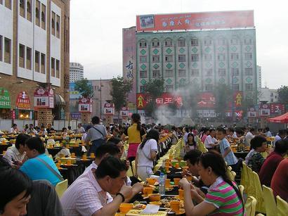 夕食は、新疆・ウィグル地区の全ての料理、果物、ビール、アイスクリームなど、なんでもあり、バイキングで食べ放題である。シシカバブ、ビール、ポロ、スイカを小皿に盛って自分の席まで持ってきて、食べながら歌舞を見ることにした。人気のある料理や。アイスクリームのところは長蛇の列で、あっと言う間に無くなってしまう。