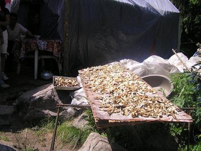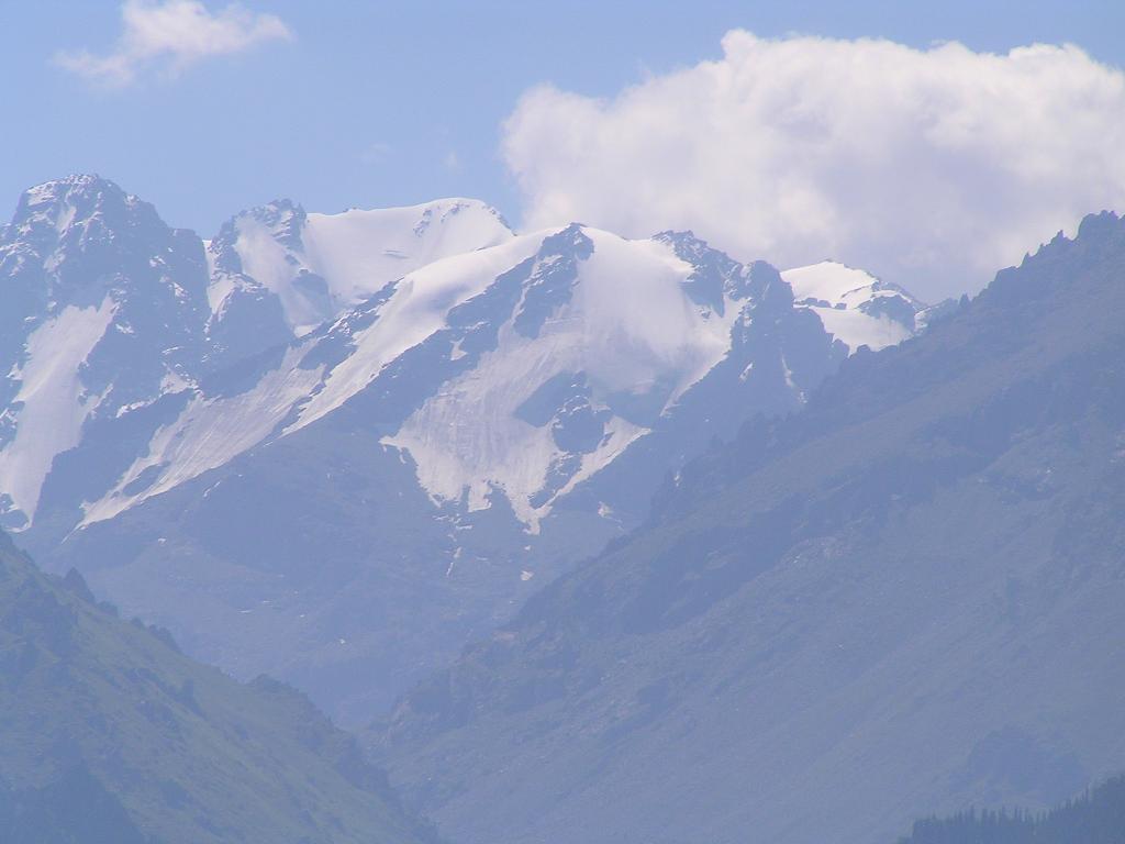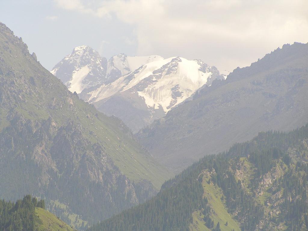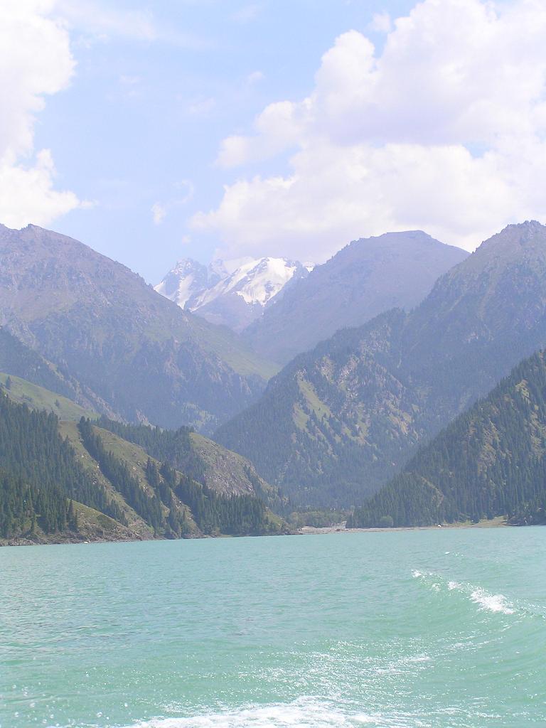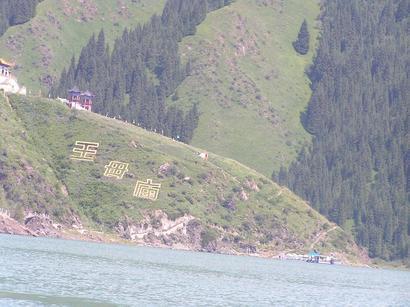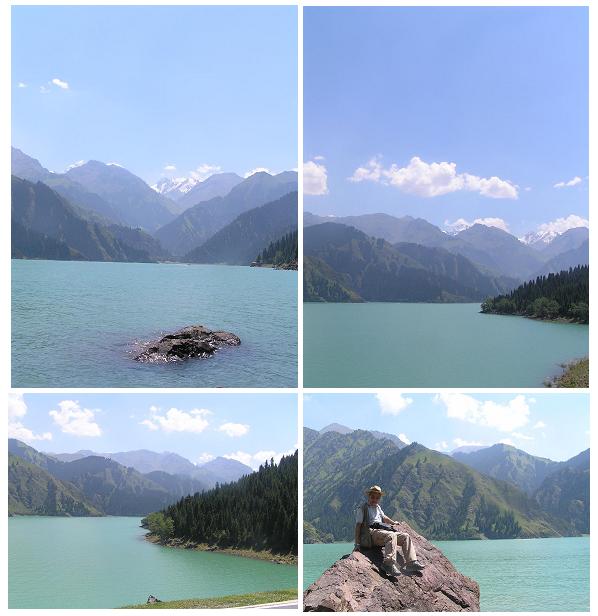 湖面から、天山ゴボタ峰を見やると先程よりは冠雪した部分が大きく見えている。そしてその手前に見える山の斜面には尖った岩が沢山あり、その岩の無いところはびっしり隙間無く、緑の絨毯が敷き詰められているのが分かる(写真上3)この緑の絨緞(草木)に花が咲くことがあれば、さぞかし壮観であろう。