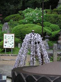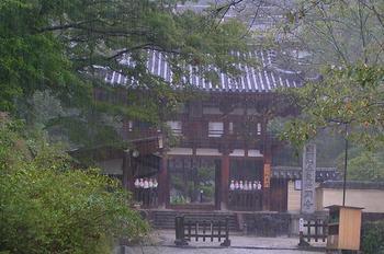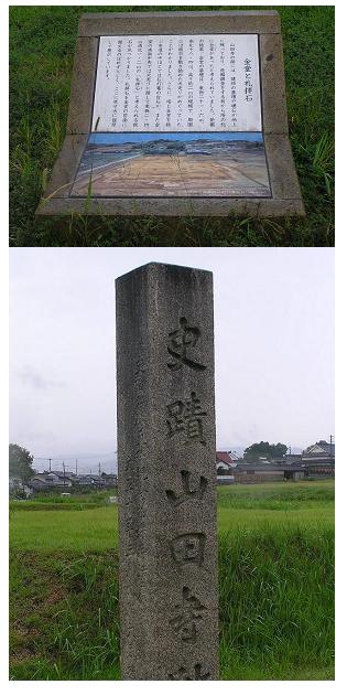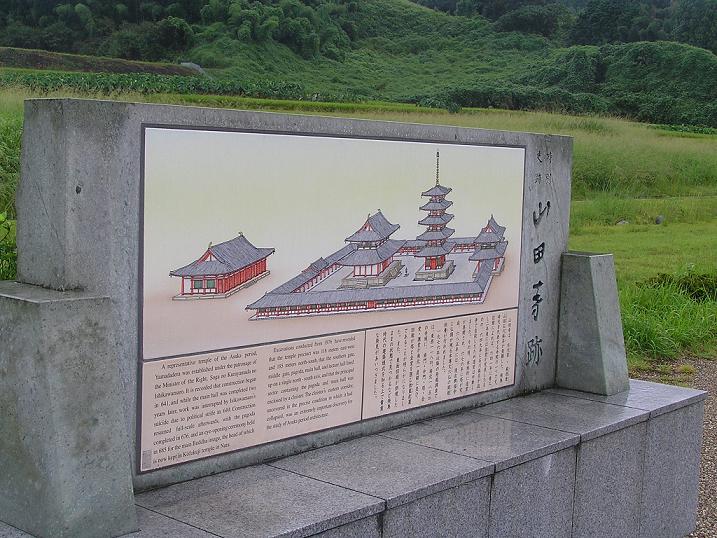 翌日は朝8:00に出発することにした。JR奈良駅の西側すぐ近くのオリックスレンタカーで車を借りる手続きや、カーナビをセットする時間を考えると、出発時刻は9:00前後になると読んでいた。 借用した車は日産マーチ、早速カーナビを行き先石舞台にセットし、8:40には出発できた。国道169号線を南下、天理、桜井を通過して台風13号の余波の雨中を走り、一時間ほど走って左折して県道15号へ逸れる。間もなく左手に「山田寺跡」という表示があったので左折すると細い路に入り込み、正面に寺が見えた。 右折する方が支道の様に見えたが、そちらへ入ると車を行き交うことが出来ないとの表示があり、やむを得ず左折する路に侵入した。それが幸いした。 右手に山田寺跡の石標(写真1)が、左手に駐車場が見え、路は行き止まりになっていた。雨がすでに弱からず降っていたので家内は車の中で待っているという。それならば、と傘をさし一人で雨降る山田寺跡へと向かった。 視線を高く上げると、遠くに雲がたなびく飛鳥の山並みが見え、それだけで古代への郷愁が募ってしまい、雨が降っているのもまた一興と思えた。 「山田寺」、簡単明瞭な漢字の名前であるが、あまり聞いたことのある寺ではない。普通は、地名や方角、例えば岡寺、飛鳥寺、東大寺、西大寺。あるいは仏教的な響きのする言葉、例えば円通寺、華厳寺、南禅寺、法隆寺、地蔵院などが耳に慣れているが、「山田寺」というのは何か響きが違う。「ヤマダクンちの寺」というのがぴったりと思っていたのだが、その通りで、この寺は大化の改新の功臣、蘇我倉山田石川麻呂の発願によって643年に建立された,法隆寺よりも半世紀もさかのぼる寺院跡で、現在は、中門跡、回廊、五重塔跡、金堂跡が、盛り土、あるいは礎石という形で残っているだけである。 南門、回廊の一部を兼ねる中門、五重塔、金堂、そして回廊の外に講堂と言うように南北に一直線に並ぶ伽藍配置となっている。 どこまで足を踏み込んでよいのか分からなかったが、雨水をたっぷり吸ったスポンジのように敷き詰められた芝地を傘をさしながら靴をビショビショにしながら歩を南へと進めた。 不思議なことに車に戻ろうなどとさらさら思わなかった。まるで飛鳥に眠る亡霊達が足を捕まえて離してくれない様な、足が根をはってしまったような不思議な感覚だった。