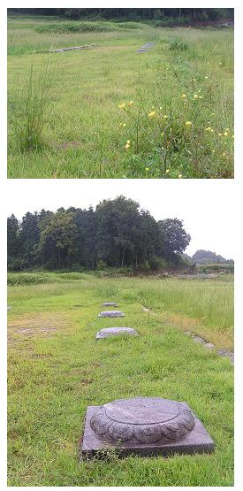 最初に目に入ったのが回廊東側の礎石で4個づつ二列に南北に向いて並んでいた(写真2)。勿論復元したもので、礎石には蓮弁が施されている。後で調べてみたら、北側にも回廊礎石が残されていて、そちらは本物らしかったが、一面芝が生え茂り、目に入らなかったのふだろう。更に歩を進めると、「史跡山田寺跡」と彫られた石標が雨霧の中に見つかり、更に歩を進めると、金堂、礼拝石と表示された石標が置かれ、その石標には、金堂、礼拝石、更には、金堂の前に石灯篭、周りには犬走りがめぐらされていたことが、配置図と共に示されていた(写真3)。