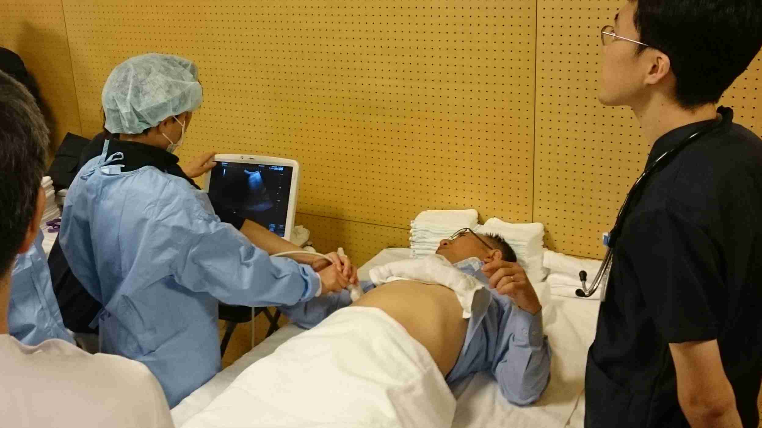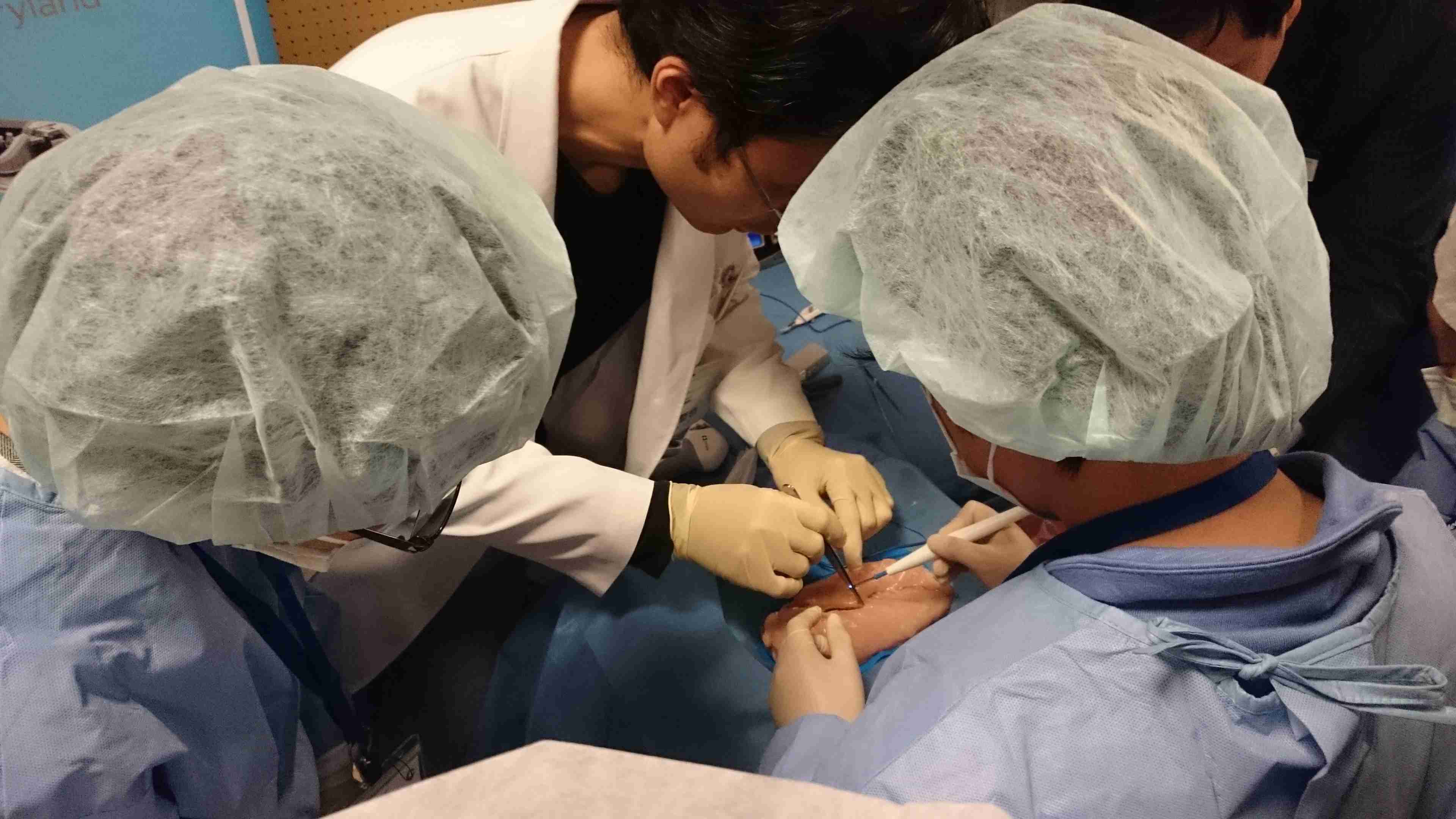 手元を映すテレビモニターを見ながらアームで糸をつまんで組織を縫い合わせる腹腔鏡縫合体験、鶏肉を電気メスで切る電気メス体験、体の外から体の中の様子をモニターで見るエコーの体験のほか、開いたお腹を縫い合わせる開腹縫合体験や自動縫合器体験など、大人も目を見張る本格的な外科手術体験の数々・・・。