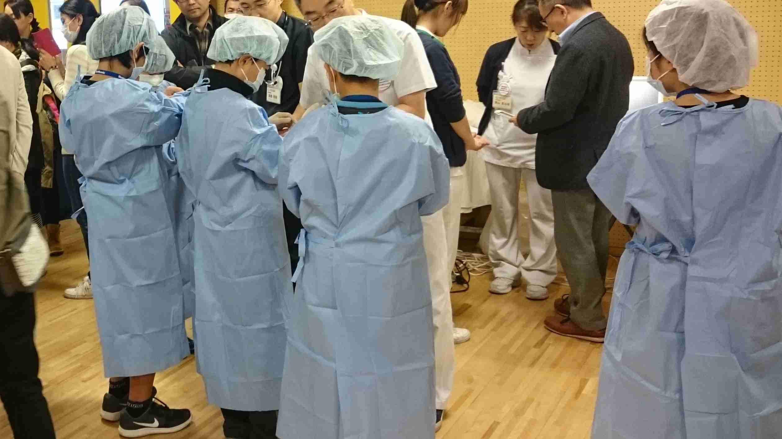 オリエンテーションを終えると、子供たちは本格的な手術衣に着替えて、チーム別に記念写真を撮ったら、待ちに待った外科手術体験です☆