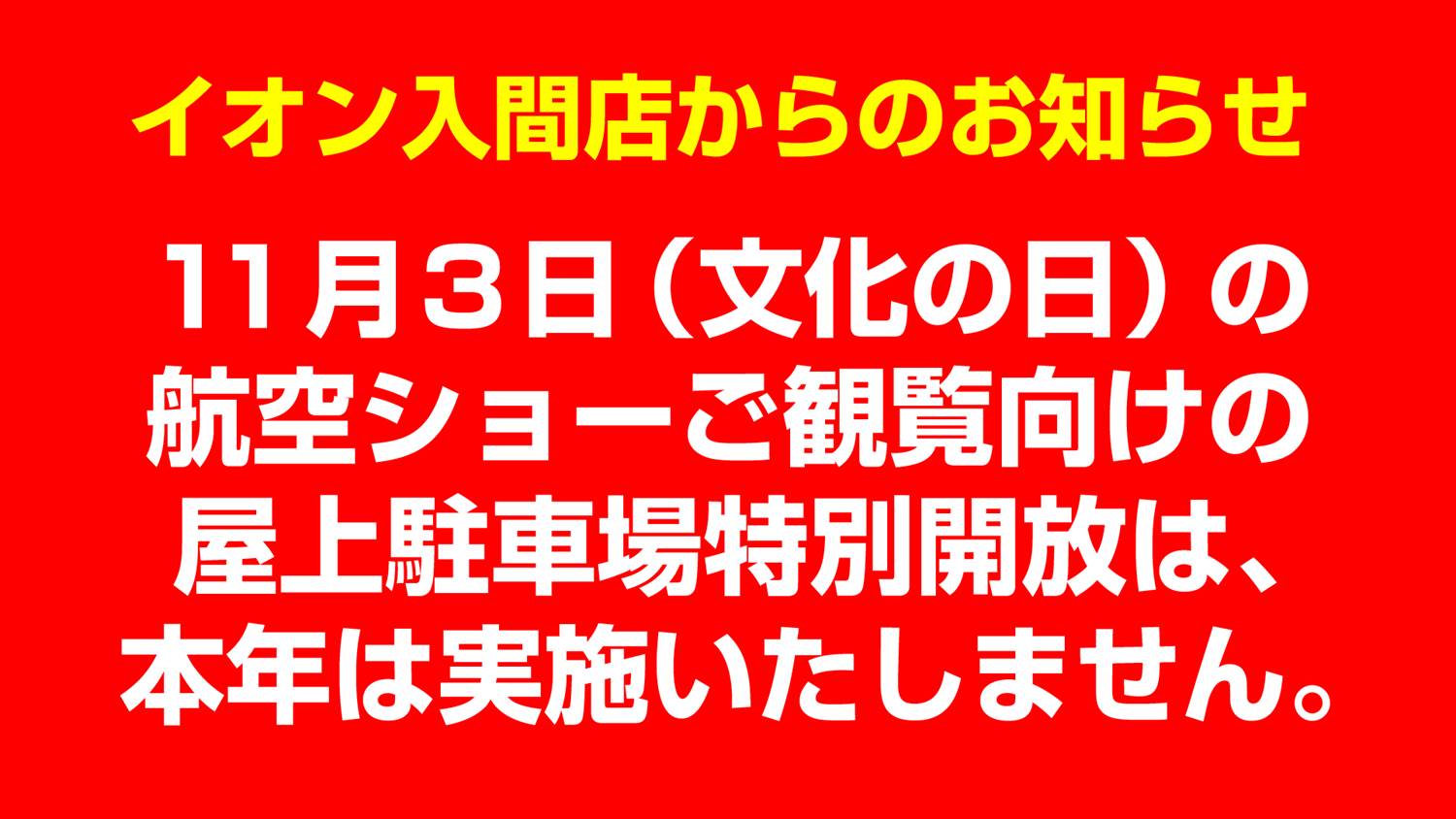 11/3入間航空祭(航空ショー)観覧用の屋上駐車場特別解放は、本年は実施致しません。