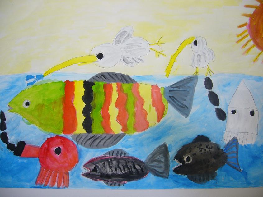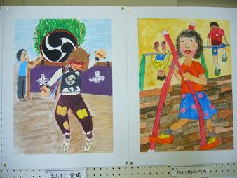 そして佐渡市のみんなは、授業風景はもちろん、入間市にはない鬼太鼓や海の生き物を描いています。