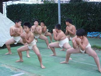市民体育館横のわんぱく相撲本土俵で稽古を積む入間少年相撲クラブ