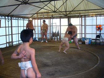 私がお邪魔したこの日は、なんと大相撲春日野部屋の力士のみなさんが、稽古をつけてくれていました。