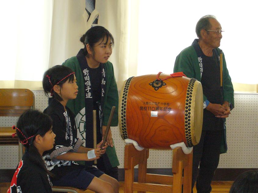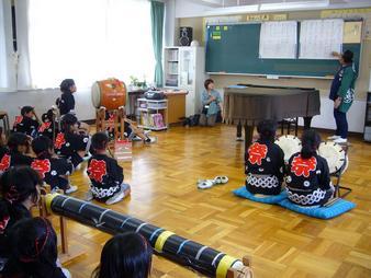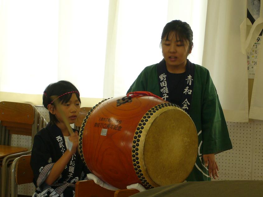 西武小学校のすぐ近くでもある野田の地区で活動する囃子連「青和会」の皆さんから伝統芸能である「野田ばやし」を教わりました。