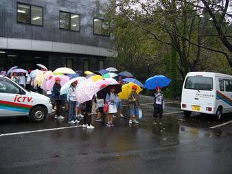 あいにくの雨になってしまいましたが・・・みんなは、元気に学校から歩いて入間テレビに到着!