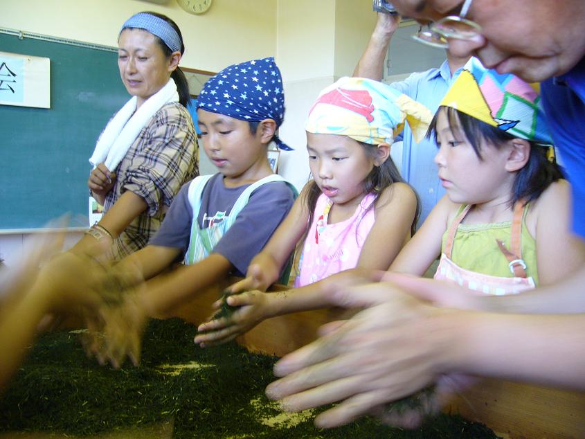 子どもたちはそこで、お茶の葉を手で揉んで作るお茶作りをしました!