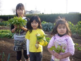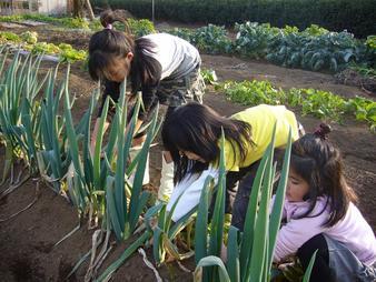 冬休みの終わり、ケーブルテレビの近くの畑で、野菜を採っている女の子たちを発見!