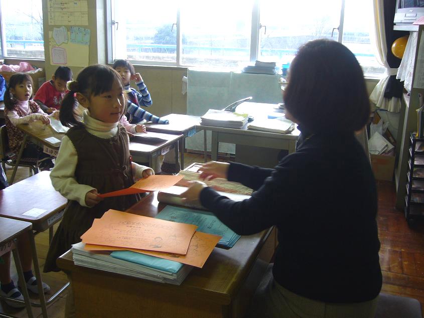 今日は、高倉小学校の1年1組にお邪魔して、通知表をもらう所を見てきました