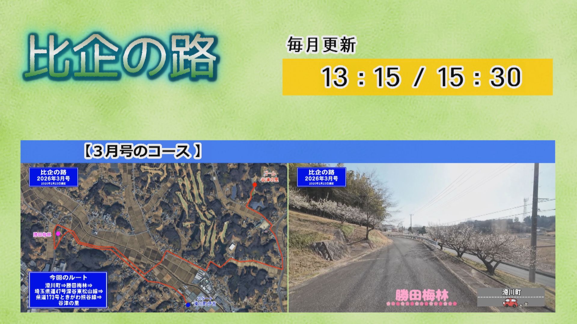 【NEWS030】 <ニュース> ・企画展〜滑川ゆかりの偉人と文化財〜(Part2:大塚大恵八と文化財及び宮島勘左衛門と文化財) (1/6(火)〜2/1(日) 滑川町エコミュージアムセンター) ・ストリートダンスの全国大会「日本リズムダンス選手権」において3位となった児童が表敬訪問 (1/15(木) 東松山市役所市長公室) ・伊藤園〜お茶で埼玉を美しく。〜 環境保全活動 (1/17(土) 武蔵嵐山渓谷周辺樹林地(緑のトラスト第3号地)) <今旬のピックアップ> ・松本町一丁目緑地イルミネーション(東松山市)