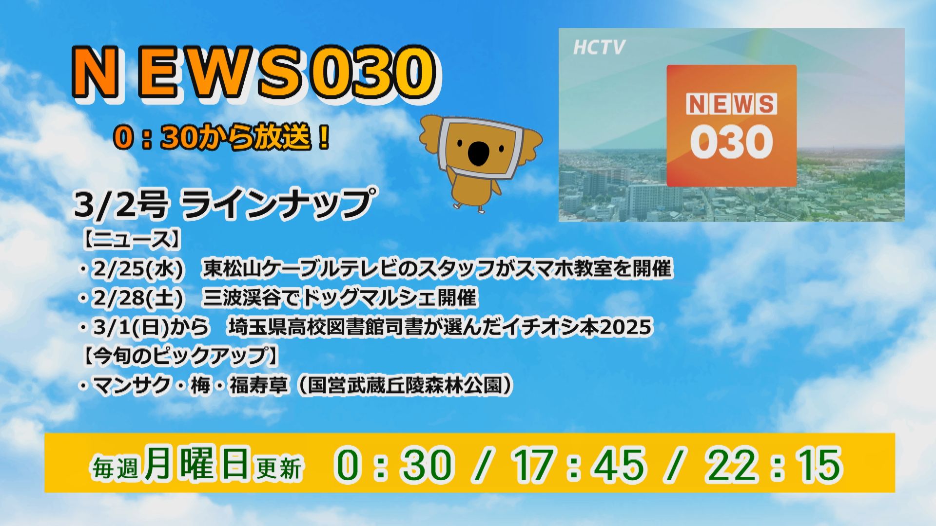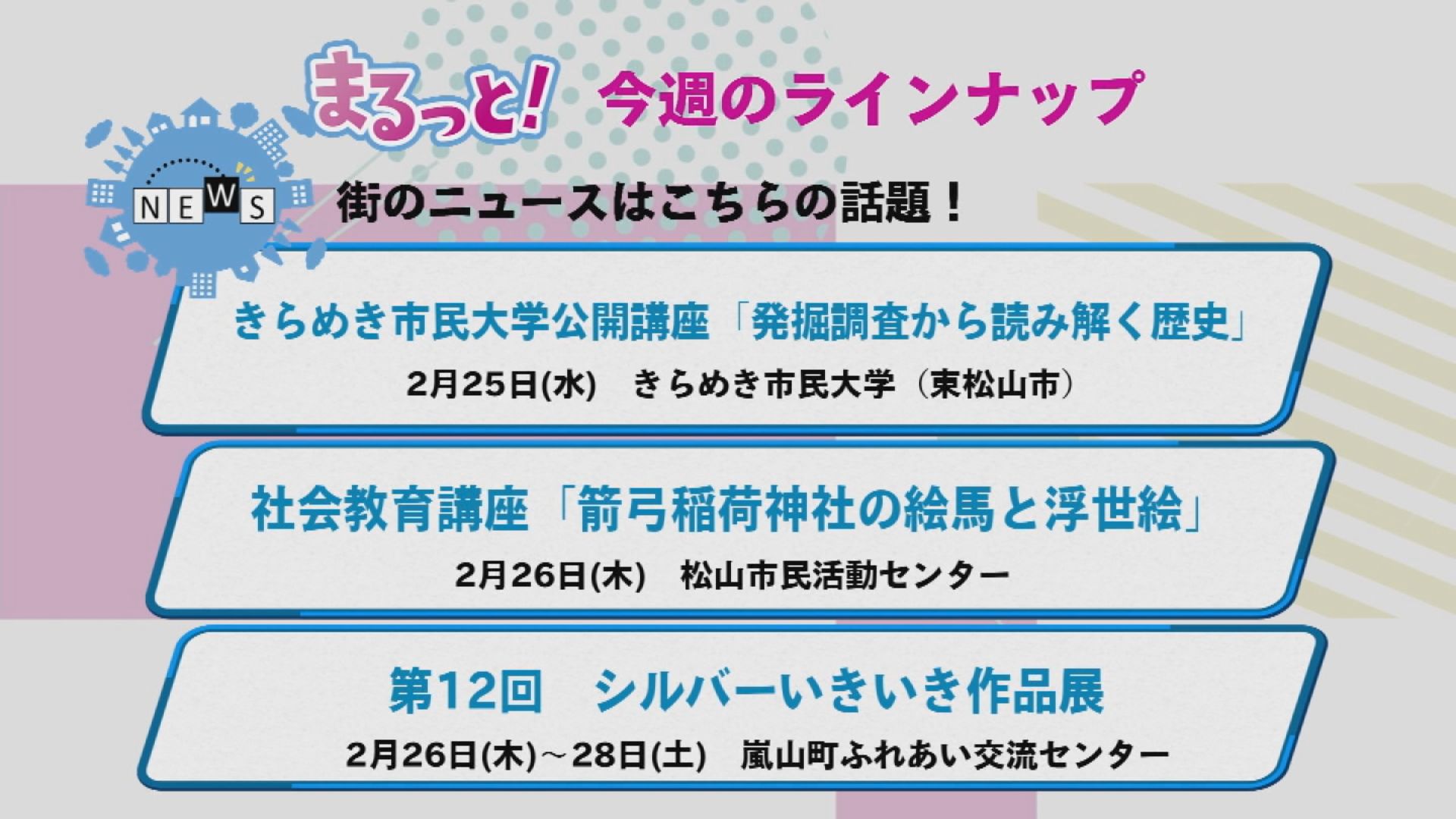 【まるっと!】 <ニュース> ・第47回 松山高校吹奏楽部クリスマスコンサート (12/28(日) 東松山市民文化センター) ・令和8年埼玉県消防協会比企支部消防出初式 (1/10(土) 比企広域消防本部(東松山市)) ・新春!農林イベント (1/12(月) 東松山市農林公園)