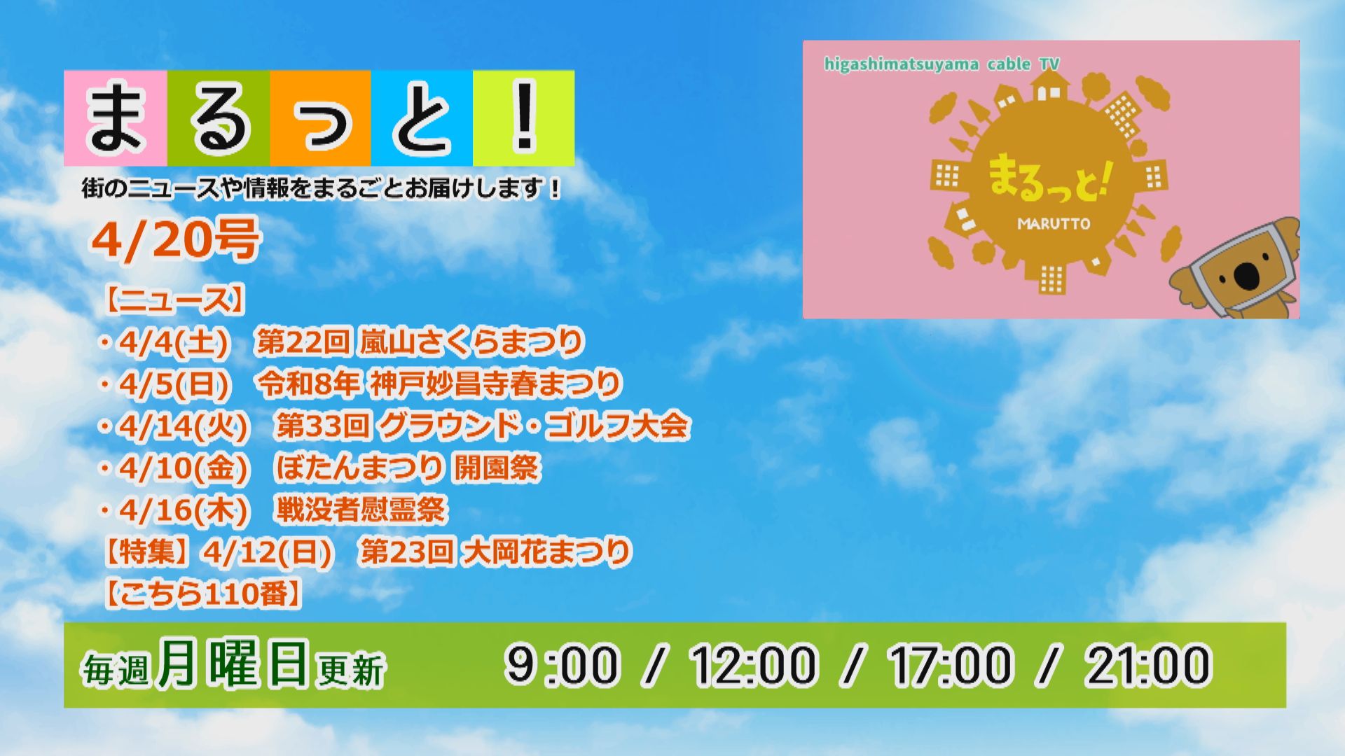 【まるっと!】(9:00〜/12:00〜/17:00〜/21:00〜) <ニュース> ・第22回 嵐山さくらまつり (4/4(土) 都幾川桜堤〜らんざん都幾川学校橋広場) ・令和8年 神戸妙昌寺春まつり (4/5(日) 妙昌寺) ・第33回 グラウンド・ゴルフ大会 (4/14(火) 都幾川リバーサイドパーク 多目的広場) ・ぼたんまつり 開園祭 (4/10(金) 箭弓稲荷神社) ・戦没者慰霊祭 (4/16(木) 箭弓稲荷神社) <特集> 第23回 大岡花まつり (4/12(日) 大岡市民活動センター) <こちら110番>