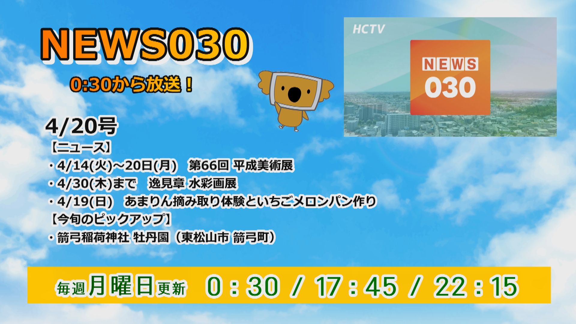 【NEWS030】(12:30〜/17:45〜/22:15〜) <ニュース> ・第66回 平成美術展 (4/14(火)〜20日(月) 東松山市立図書館) ・逸見章 水彩画展 (4/30(木)まで ギャラリー&カフェ亜露麻) ・あまりん摘み取り体験といちごメロンパン作り (4/19(日) 東松山市農林公園) <今旬のピックアップ> ・箭弓稲荷神社 牡丹園(東松山市 箭弓町)