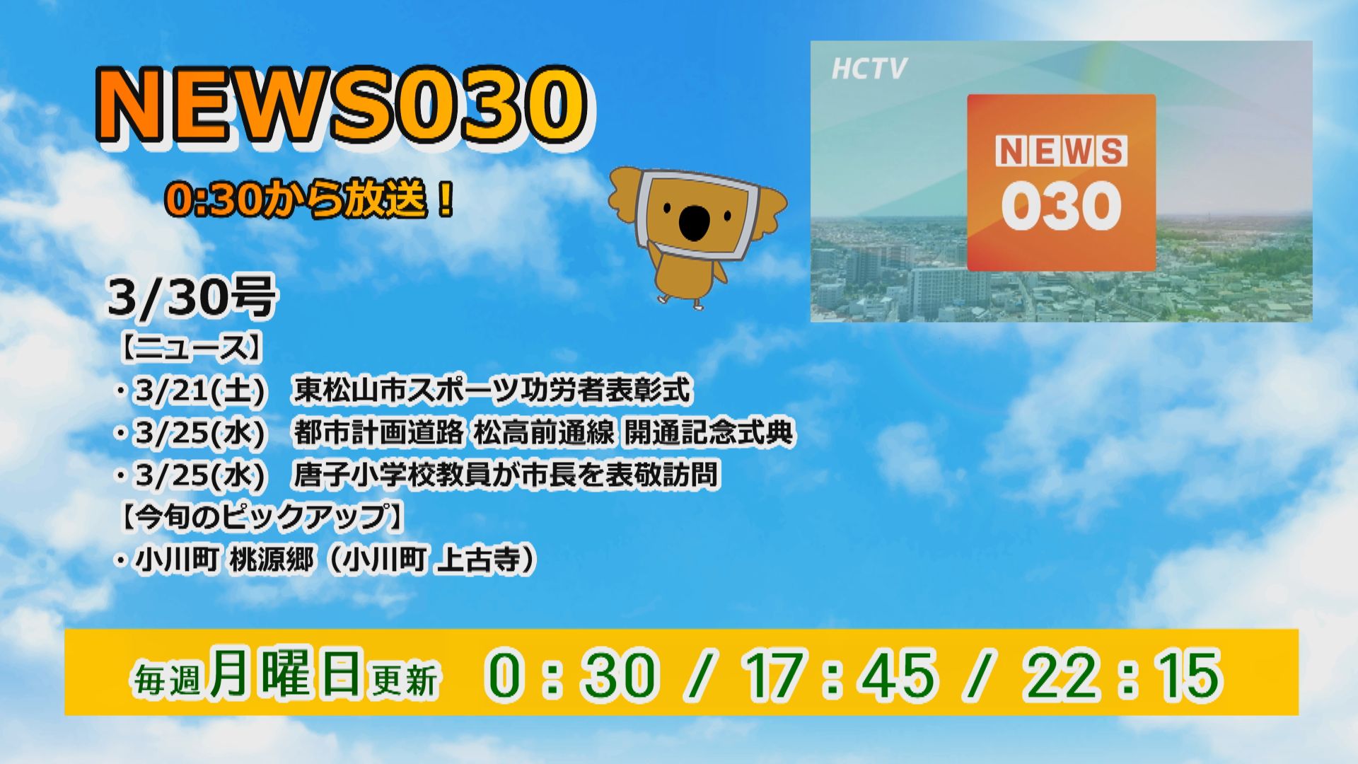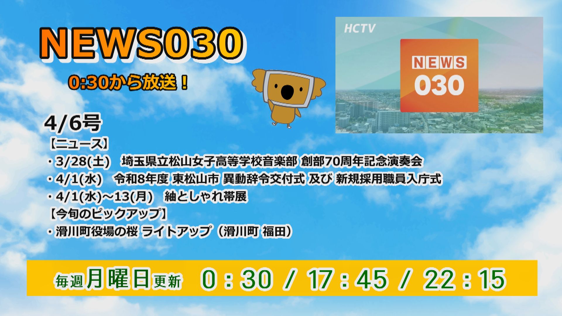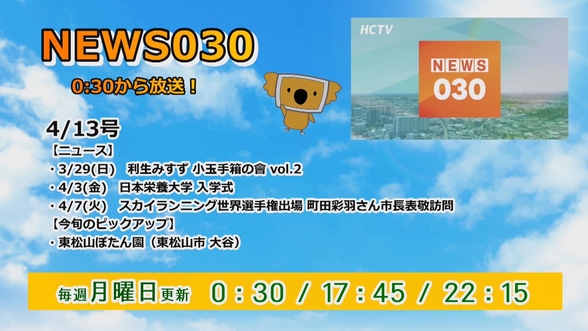 【NEWS030】(12:30〜/17:45〜/22:15〜) <ニュース> ・利生みすず小玉手箱の會 vol.2 (3/29(日) 嵐山町北部交流センター) ・日本栄養大学 令和8年度入学式 (4/3(金) 日本栄養大学坂戸キャンパス) ・スカイランニングの世界選手権「2026 ユース スカイランニング ワールド チャンピオンシップ」への出場が決まった生徒が市長を表敬訪問 (4/7(火) 東松山市役所 市長公室) <今旬のピックアップ> ・東松山ぼたん園 雲海パーク(4/1(水)〜5/10(日))