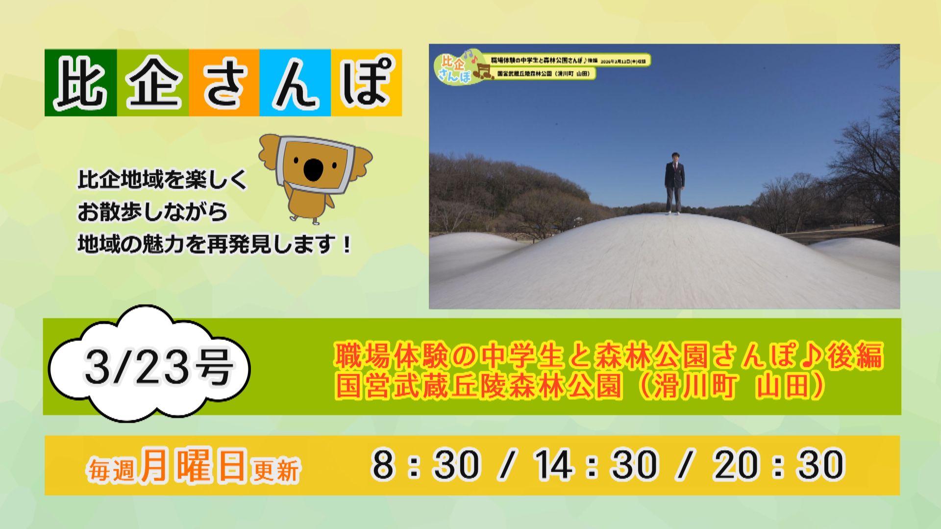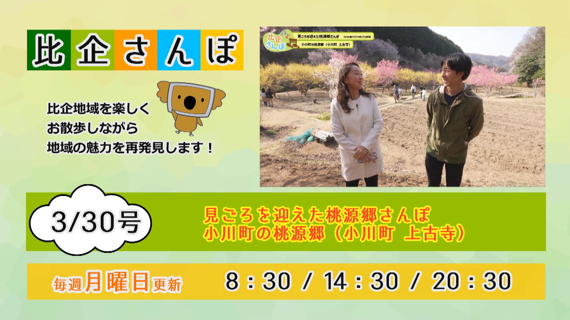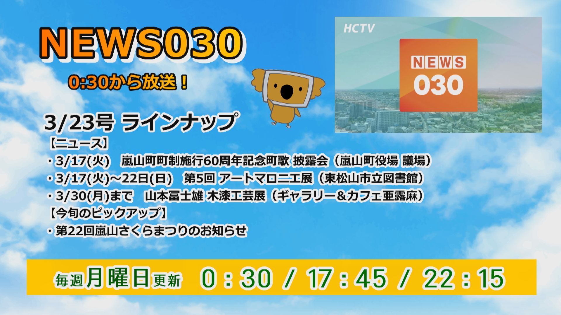 【NEWS030】(12:30〜/17:45〜/22:15〜) <ニュース> ・利生みすず小玉手箱の會 vol.2 (3/29(日) 嵐山町北部交流センター) ・日本栄養大学 令和8年度入学式 (4/3(金) 日本栄養大学坂戸キャンパス) ・スカイランニングの世界選手権「2026 ユース スカイランニング ワールド チャンピオンシップ」への出場が決まった生徒が市長を表敬訪問 (4/7(火) 東松山市役所 市長公室) <今旬のピックアップ> ・東松山ぼたん園 雲海パーク(4/1(水)〜5/10(日))
