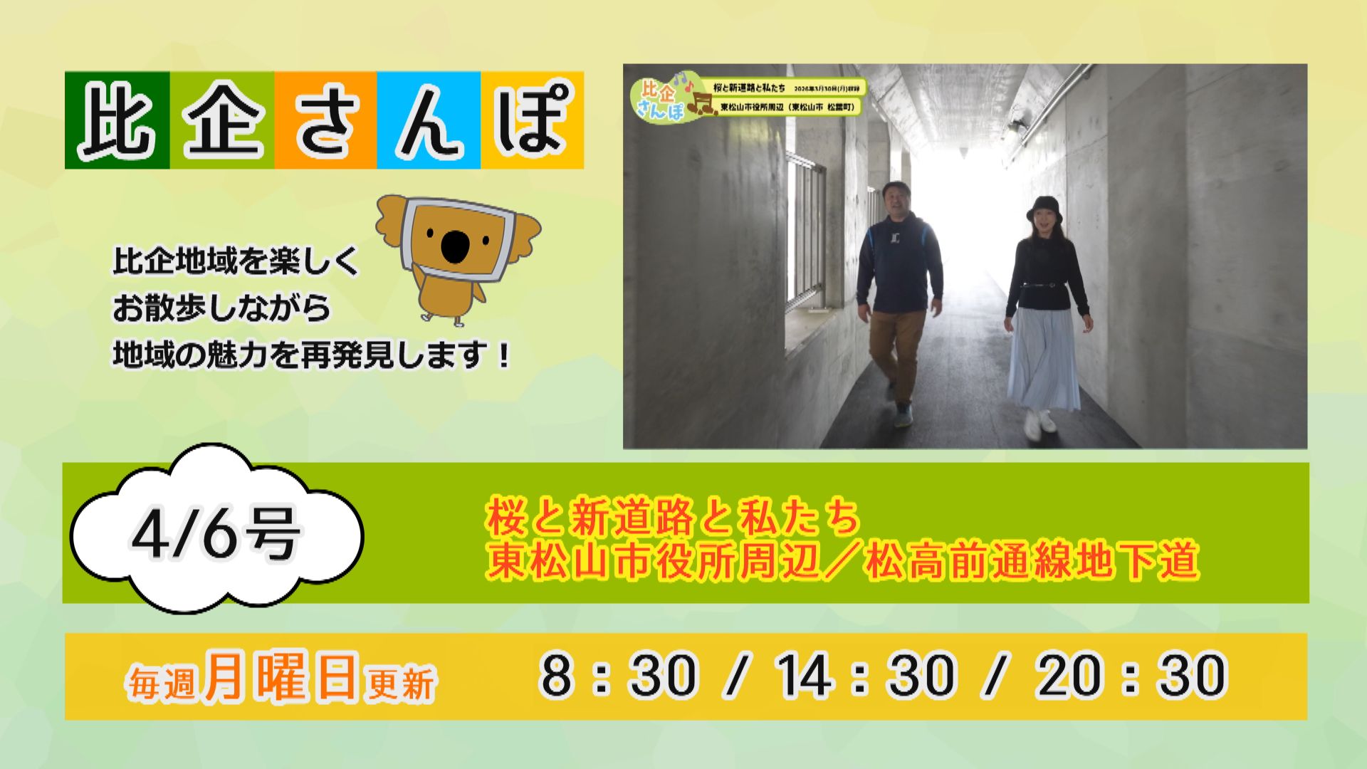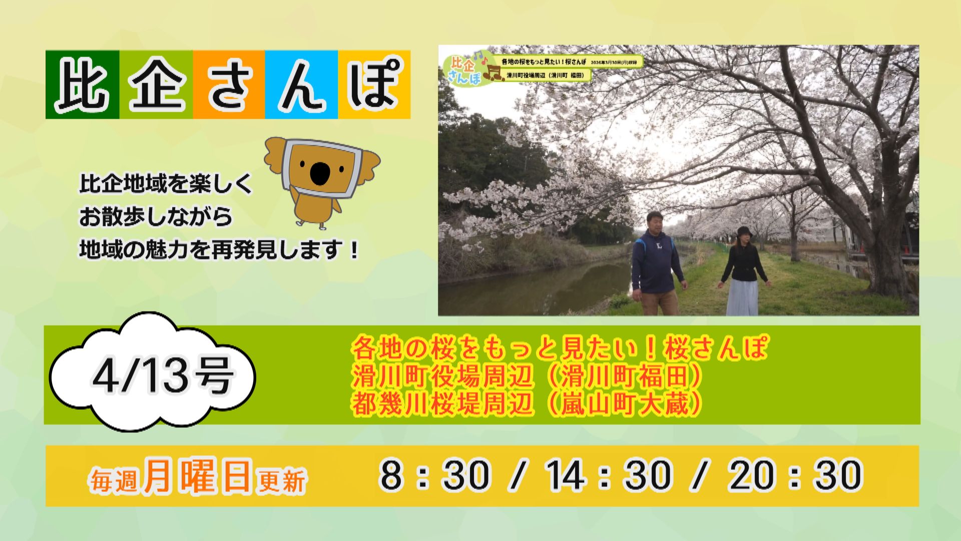 【まるっと!】(9:00〜/12:00〜/17:00〜/21:00〜) <ニュース> ・第4回 滑川さくらまつり (3/28(土) 滑川町役場駐車場) ・古澤泉傘寿記念コンサート (3/29(日) 松山市民活動センター) ・第12回十三参り (3/31(火) 箭弓稲荷神社) <特集> ・松山女子高校美術部がCOYANO COFFEEシャッターアートを制作 (4/6(月)完成 COYANO COFFEE)