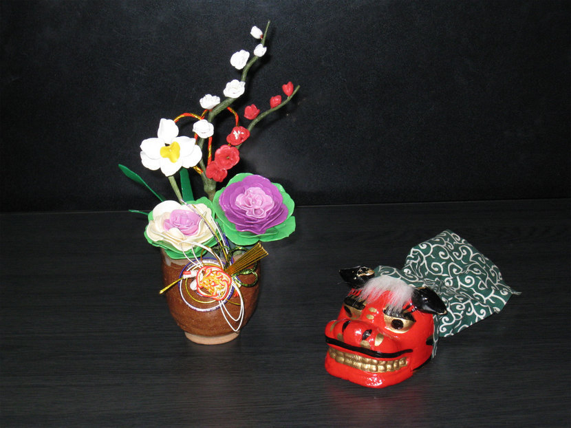また葉ボタンに水仙、紅白の梅のお飾りも作って見ました。