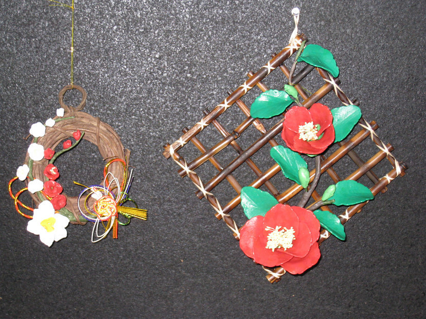 ご近所に椿が咲いる一枝頂き参考にしながら作りました。ピンクの椿でしたがビーズでちょうど良い色彩がないので赤で作りました。また、時期はずれですが来年のお正月用に梅のお飾りを作りました。お供えのお餅に付いていた鶴を使いました。