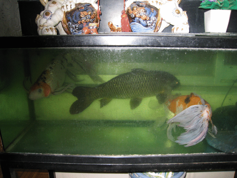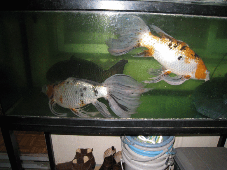 120センチの水槽には普通の鯉とヒレ長鯉(2匹)と金魚がいます 黒い鯉は息子が釣ってきて15年ぐらいになります 水槽の中で跳ねています 掃除するときは外に飛び出さないよう注意しています 大きさは60センチ前後になりました