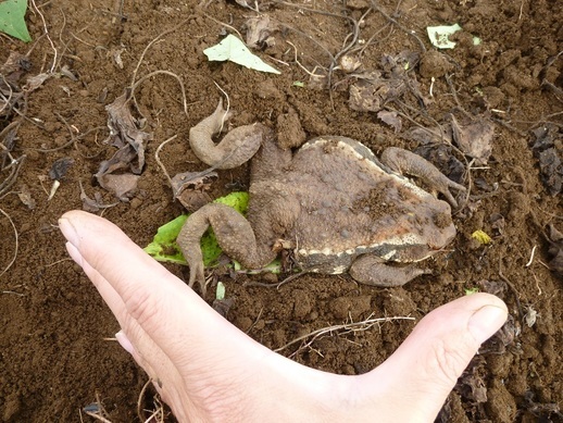 畝に茶色い物体を発見、よく見ると大きなカエルでした。