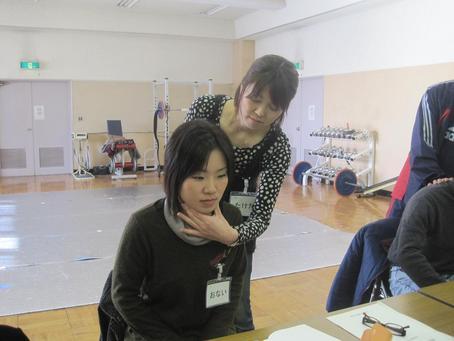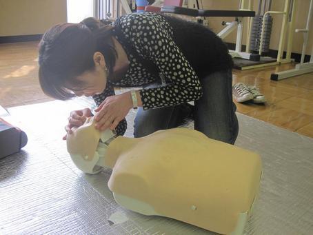 講義の中で、心肺蘇生法や異物除去の方法、AEDの取り扱い方を聞き、あとはひたすら実践でした。