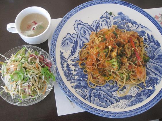 ランチメニューもありましたが、今回は”本日のおすすめ”の中から「MIXきのこと海老のパスタ」(サラダ・スープ付き1300円)と、「ネギ塩レバーのさつまいもごはん」(お味噌汁・小鉢付き1000円)をいただきました!