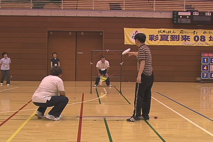 フライングディスクの競技には「アキュラシー」と「ディスタンス」があります。 アキュラシーは、的となるリングに向かって10枚のディスクを投げて、何枚通すことができるかを競う競技。 ディスタンスは、単純にディスクの飛距離を競う競技です。