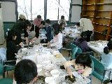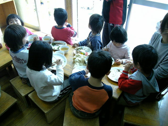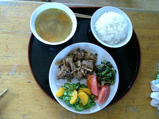 私達がお邪魔をした時は、ちょうど給食が始まる頃で園内は、子供達の活気に満ち溢れておりました。 ちなみに今日の献立は、しょうが焼きと酢の物です。この献立は、子供達にとても人気があるんだそうです。(どうです。おいしそうでしょ!) みんなが食べる給食は、調理師の方々が、愛情を込めて毎日作っているんですって!!