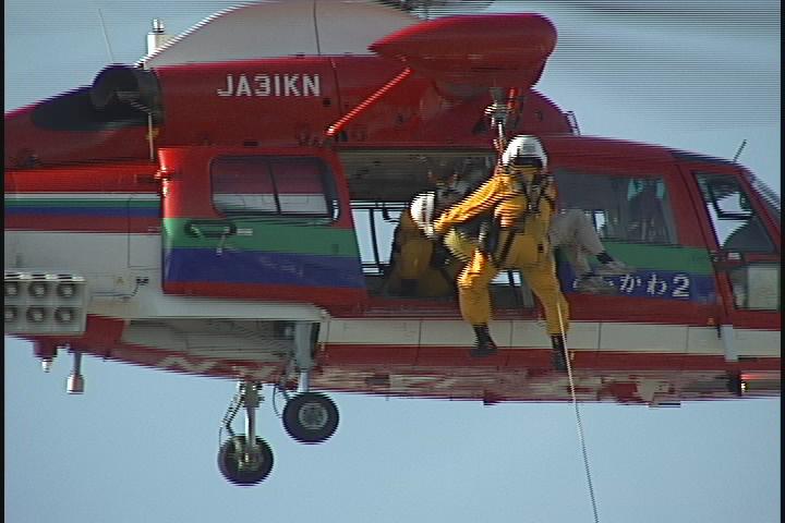 遠くから見ると細いワイヤーでするすると下りたり上がったり 要救助者を運んでいます。