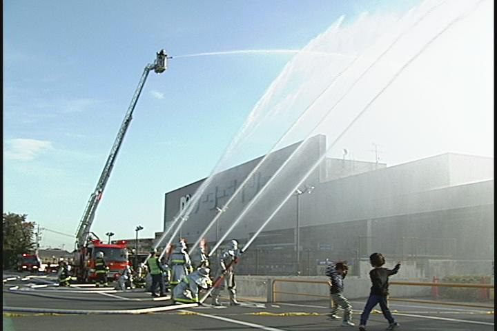風でカメラの方にも水がかかってきました。 消防隊のみなさんは真剣そのもの。結構放水も大変なんですよ!