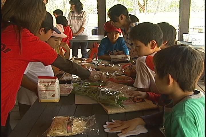 まず、スタッフがアミーゴの館庭に食材が書かれた紙の入った フィルムケースを隠しておきます。 それを2班に分かれて、子ども達が探し当てます。 探し当てたケースの中に書かれた食材を得ることができますが、中には「はずれ」もあります。 また玉ねぎ、キャベツ、肉など当てればラッキーですが、 バナナ、わらび、マシュマロ、するめ・・・といった どういう風にして食べようか迷う食材も入っています。 またそれ以前に、マッチ、まき、新聞紙など火を着けるのに 重要なものの探し当てないとバーベキューが出来ません。
