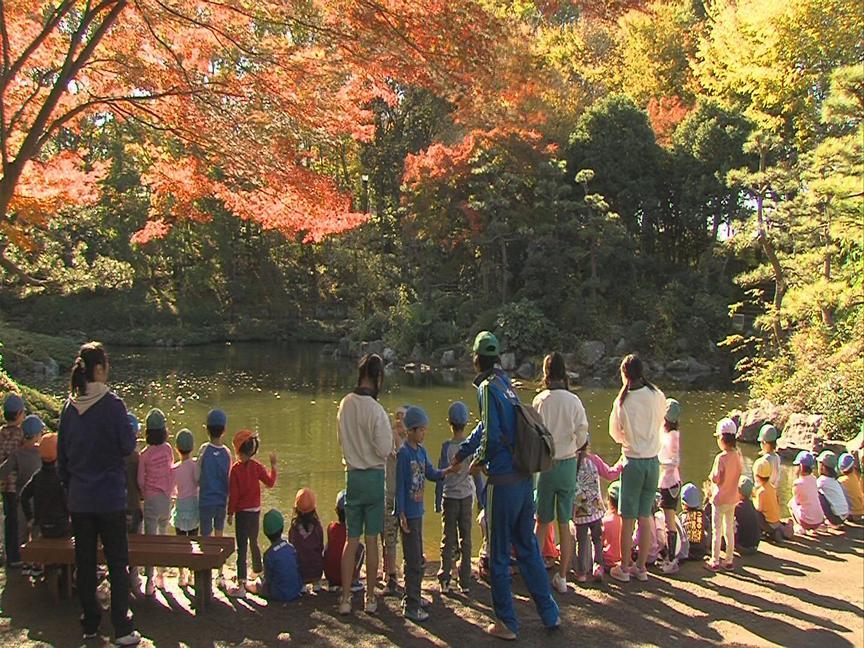園児たちがカモにお別れを言って、いよいよ放鳥となりました。