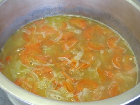 @ 人参は薄く半月切り、玉ねぎは薄切りにする。 (a)は合わせておく。 A 鍋にバター大さじ2を入れ、人参・玉ねぎを炒める。 B 水・スープの素を入れて野菜が柔らかくなるまで煮込む。 C Bをミキサーにかけて鍋に戻す。 D 火にかけ、(a)を入れてとろみがついたら、塩・胡椒する。 E 器にDを注ぎ、パセリを散らす。
