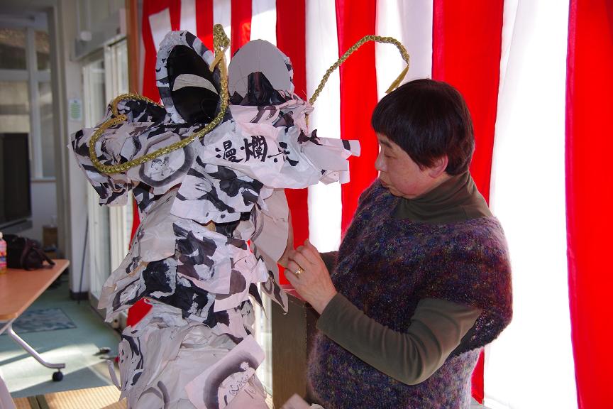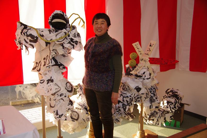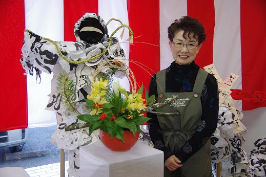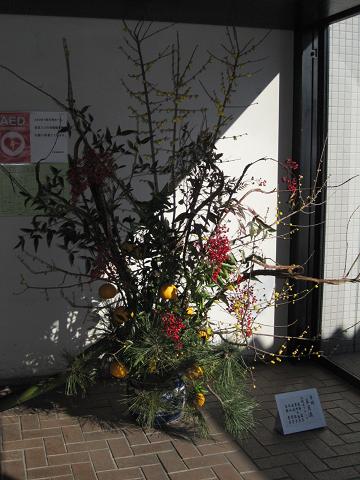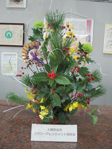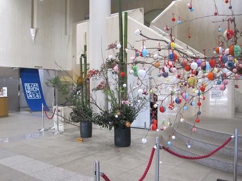 今は入間華道連盟のみなさんの大きなお正月飾りと小正月のまゆ玉飾りが入り口に展示されています。