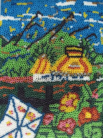 写真のストロー絵は、なんと94歳の女性の作品、ストローを短く切って紙をまいたものを1つ1つのりで貼り付けて、2ヶ月くらいかけて作りました。