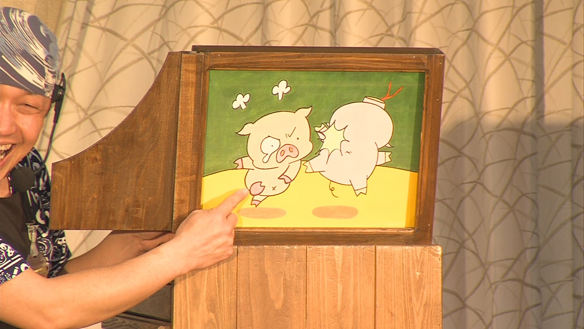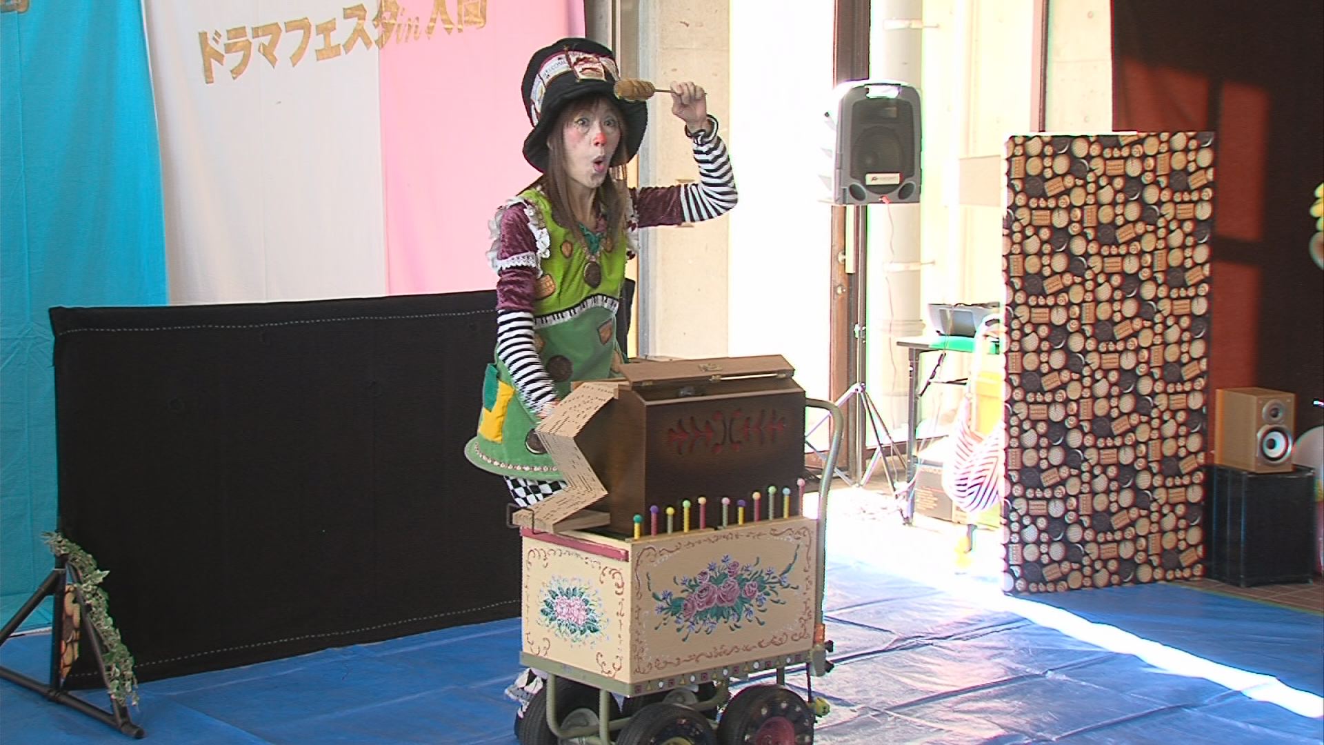 ドラマフェスタのテーマソングに合わせた、各参加団体の紹介&見どころPRの後は、シェフ伊とうの手廻しオルガンショーが始まり、ピエロに扮したシェフ伊とうが、パントマイムやバルーンアートで会場を盛り上げました。