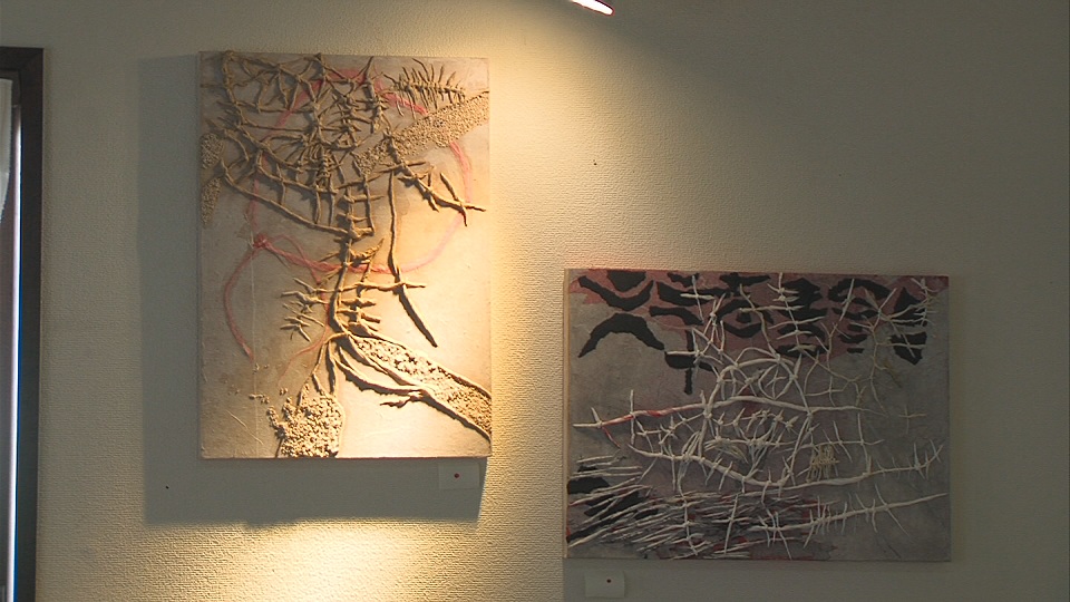 アクリル、和紙、布、土、ボールペン、墨などを織り交ぜて使い、 小さな個の集合から生まれる「力」を表現しています。