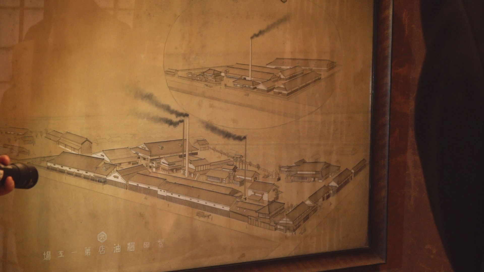 絵画には、味噌や醤油の醸造蔵や長い煙突の姿が克明に描かれています。
