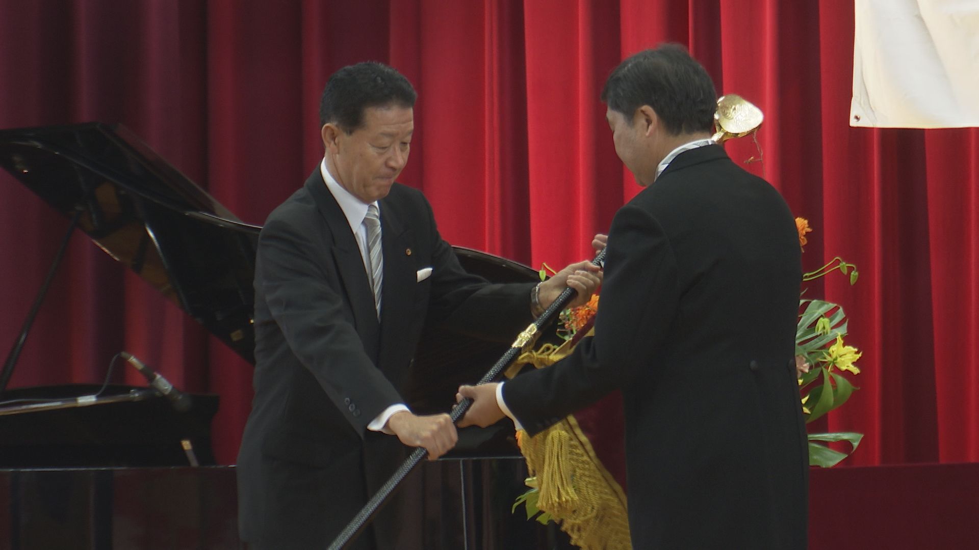 開校式では、中田教育長から新しい西武中学校の校旗が金子校長に手渡されました。