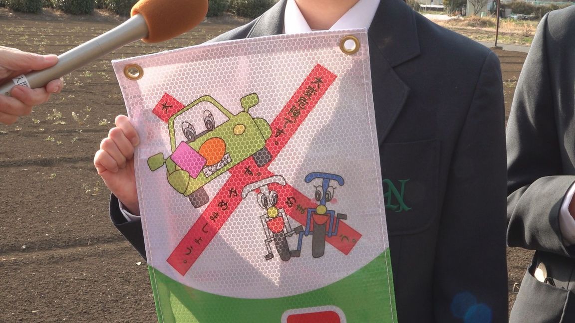 慣れない通学路で事故が起きないようにと、生徒たちは美術の授業で交通安全を呼びかけるデザインを考えました。