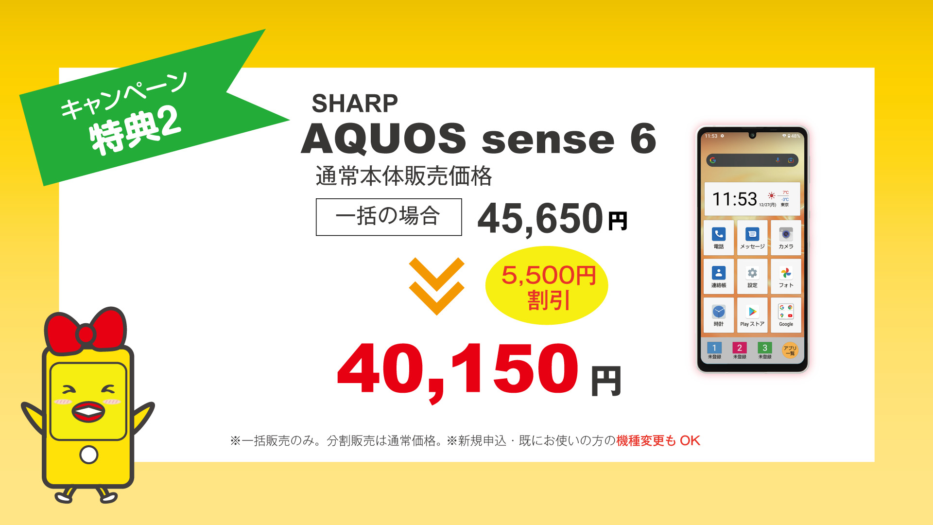 SHARP AQUOSsense6を一括ご購入の場合、5500円引きの40150円!