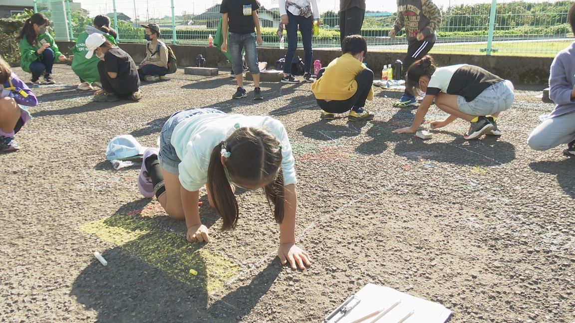 公民館の駐車場に、チョークを使って絵を描こう!!!という企画なんです!