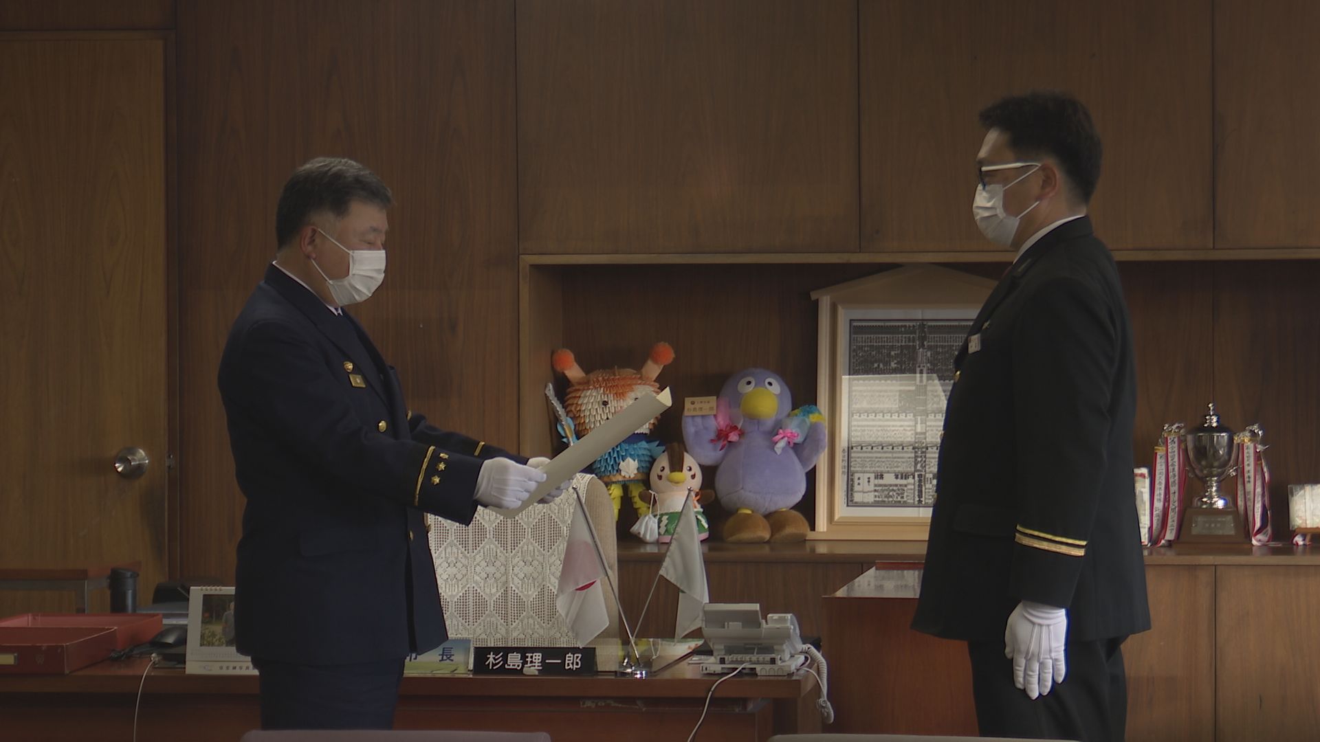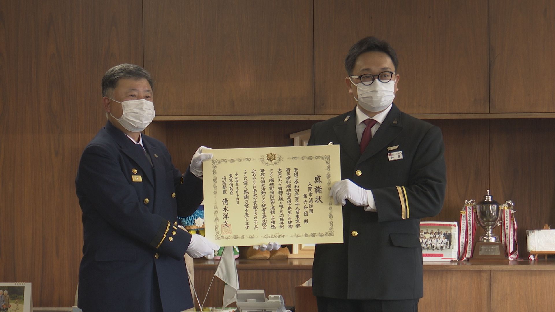 今日は入間市消防団が、東京消防庁消防総監感謝状を授与されました。