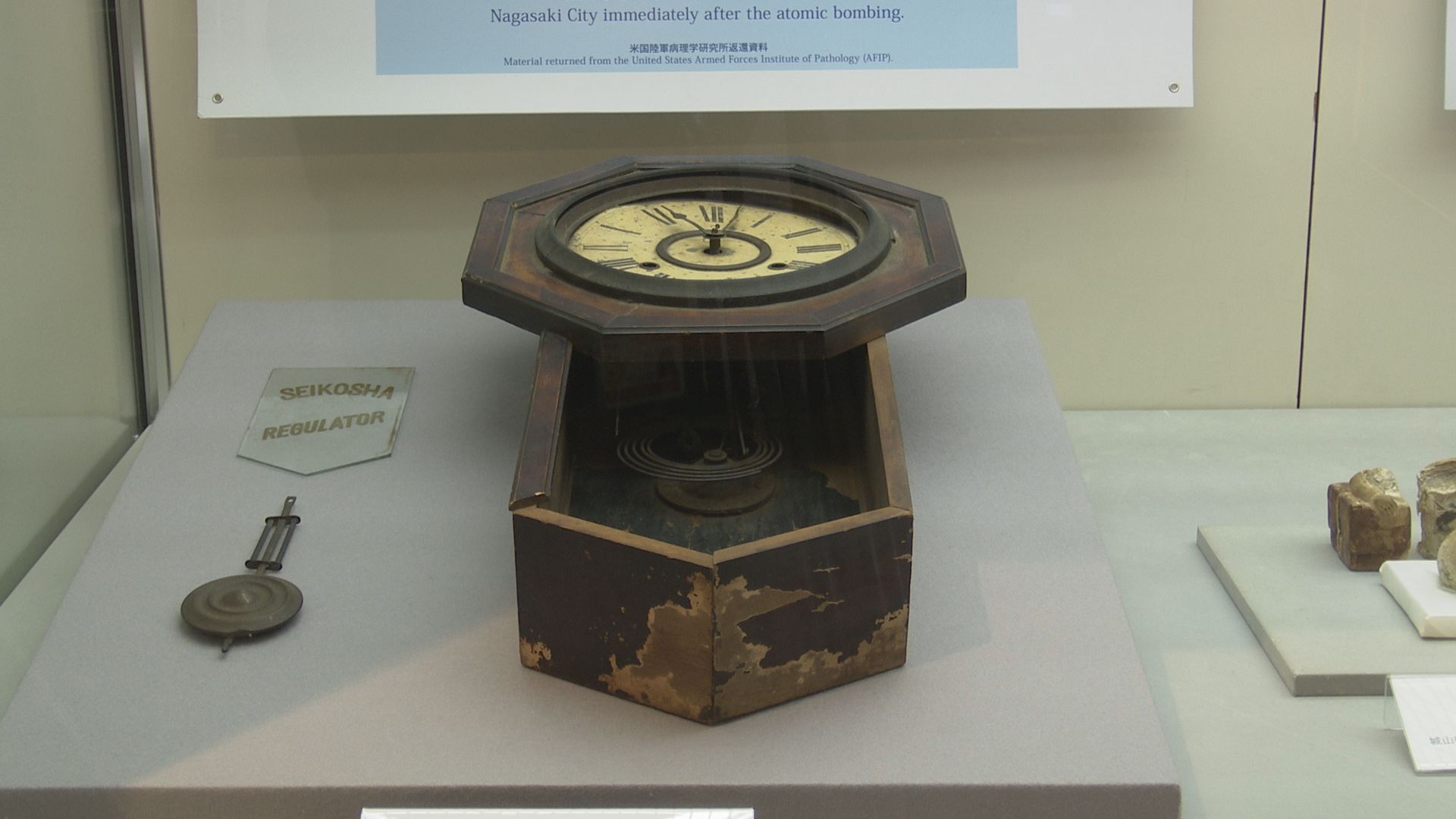 今年は8月4日から12日まで、入間市博物館アリットの特別展示室で開催しています。 今回はアリットに所蔵されているものだけではなく、長崎原爆資料館に所蔵されている展示品19点も展示されています。 長崎に原子爆弾が投下された11時2分を指したまま止まった時計、歪んだグラスや瓶、ボロボロのシャツなど、当時の悲惨な様子を伺い知ることができます。 またパネルの展示で原子爆弾の恐ろしさや被害などを知ることもできます。